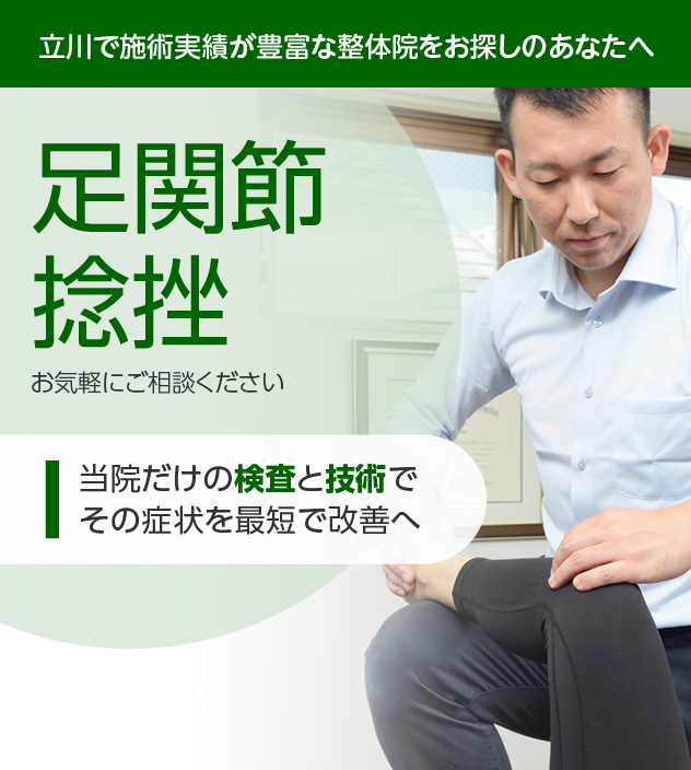 痛みのある場所だけにとらわれず、足関節捻挫の原因を見極めた上で、その場限りではない根本的なケアを、豊富な経験をもとに行っていきますので、安心してお任せください。