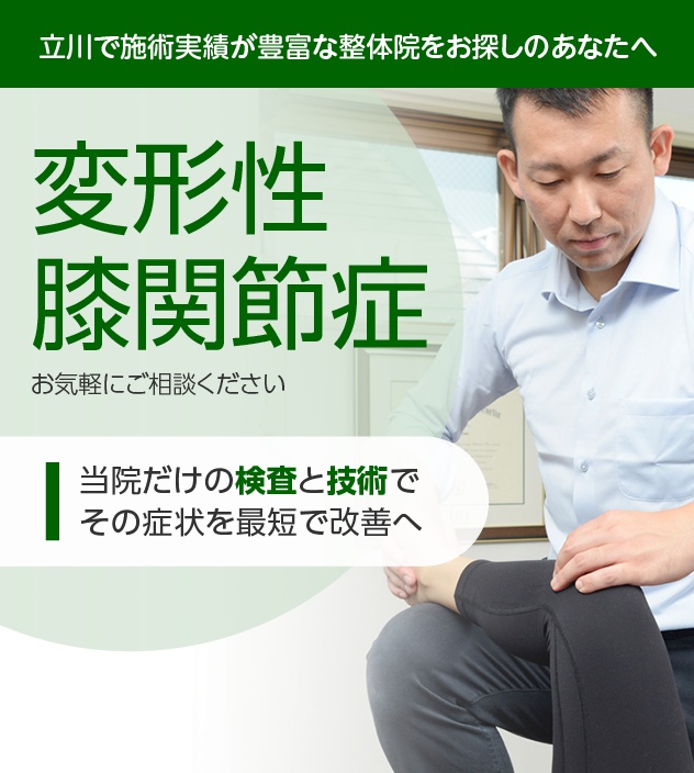 痛みのある場所だけにとらわれず、変形性膝関節症の原因を見極めた上で、その場限りではない根本的なケアを、豊富な経験をもとに行っていきますので、安心してお任せください。