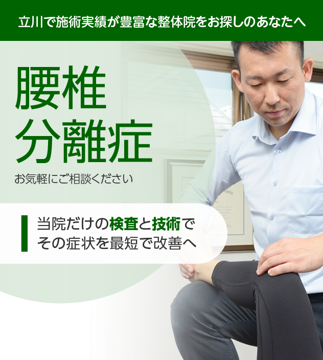 痛みのある場所だけにとらわれず、腰椎分離症の本当の原因を見極めた上で、その場限りではない根本的なケアを、豊富な経験をもとに行っていきますので、安心してお任せください。