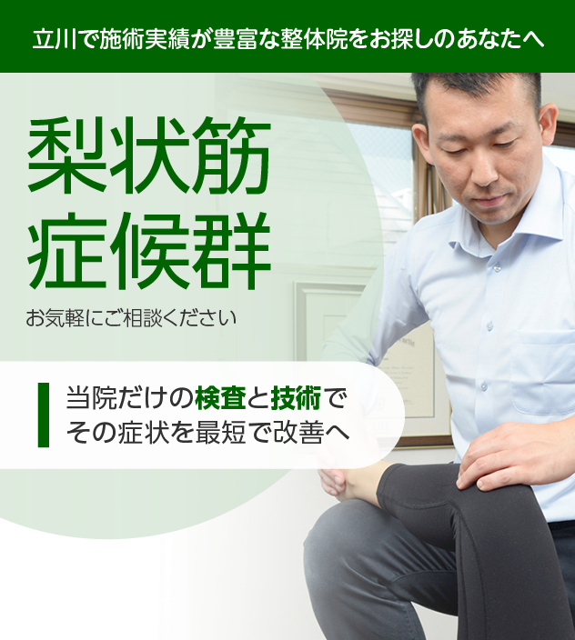 痛みのある場所だけにとらわれず、梨状筋症候群の原因を見極めた上で、その場限りではない根本的なケアを、豊富な経験をもとに行っていきますので、安心してお任せください。